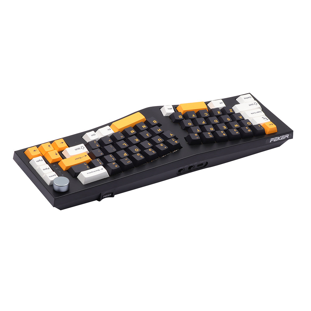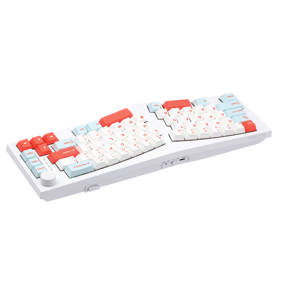 Feker has released different trendy keyboards and DIY kits for enthusiasts. With this Alice layout, Feker a 65% layout which is split into left and right halves, leaving a small gap in between. The letters and the bottom row are angled at a certain degree to fit the direction of your hands when staying on the desk naturally. The spacebar is split into two pieces to be accommodate this design. It is considered to reach a balance at the aspect of ergonomics. Apart from the typical Alice features, the Feker’s Alice 80 goes further with a media control knob. With this keyboard, you can lay your hands on the keyboard freely and increase comfortable typing experiences simultaneously.
