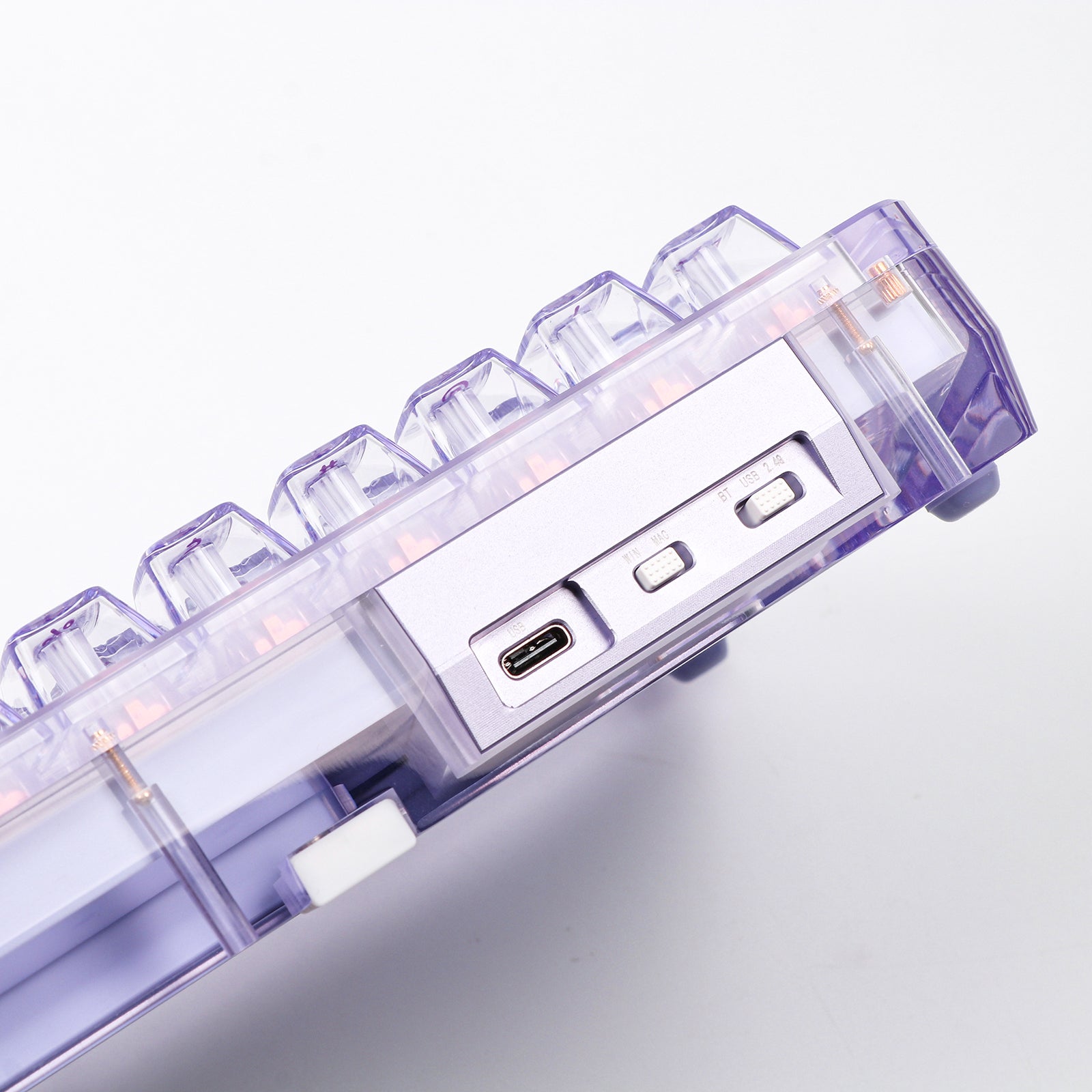The Phantom 68 showcases a stunning transparent acrylic construction, reflecting the KiiBOOM brand's dedication to innovation, quality, and aesthetic appeal. With crystal clear, shadow black, blushing pink, mystic purple color, you can choose the one to fit your best. Crystal Clear - Embrace the transparent elegance of the Crystal Clear Phantom 68, showcasing its unique acrylic design and components. Shadow Black - Exude sophistication with the Shadow Black Phantom 68, featuring a transparent black hue that adds a touch of mystery to your setup. Blushing Pink - Brighten up your workspace with the Blushing Pink Phantom 68, offering a soft and playful transparent pink tone that stands out. Mystic Purple - Immerse yourself in the enchanting aura of the Mystic Purple Phantom 68, boasting a vibrant transparent purple hue that elevates your keyboard's appearance.